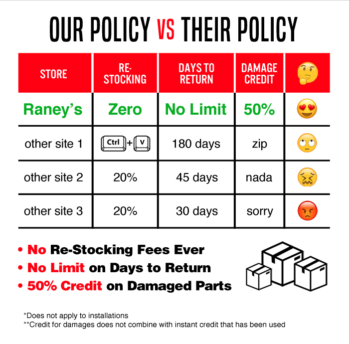 We are proud to be the ONLY company in this industry that does not charge our customers restocking fees. We are confident in our products and we want to provide our customers with the BEST service. At Raney's, as long as we receive your package back in the same condition it left, there are no hidden fees.